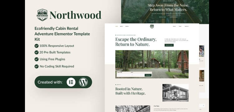 Northwood - Eco-Friendly Cabin Rental Adventure Elementor Template Kit